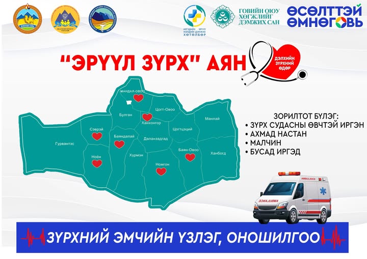 ✅ "ӨСӨЛТТЭЙ ӨМНӨГОВЬ" хөтөлбөрийн хүрээнд ОЮУ ТОЛГОЙ ХХК, ГОВИЙН ОЮУ хөгжлийг дэмжих сантай хамтран "Өмнөговь аймгийн иргэдийн эрүүл мэндийг дэмжих" хөтөлбөрийн санхүүжилтээр "Эрүүл зүрх" аяны хүрээнд зүрхний нарийн мэргэжлийн эмчийг үзлэг, оношилгоог зохион байгуулан, хамтран хэрэгжүүлэн ажиллаж байна.