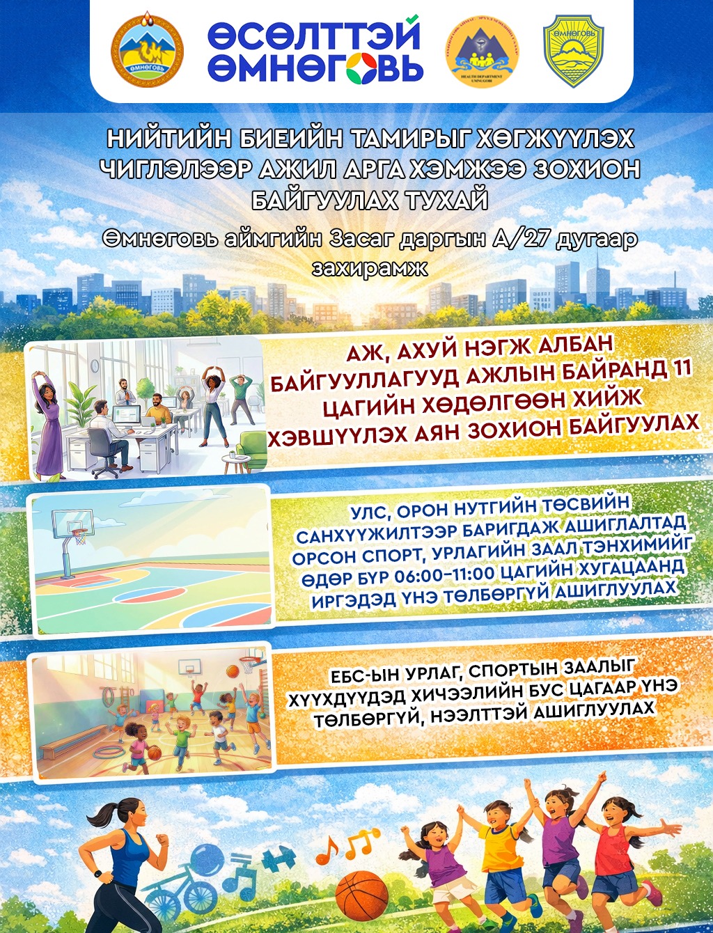 НИЙТИЙН БИЕИЙН ТАМИРЫГ ХӨГЖҮҮЛЭХ, ХҮН АМЫГ ӨВЧЛӨЛ, ХӨДӨЛГӨӨНИЙ ДУТГАДЛААС УРЬДЧИЛАН СЭРГИЙЛЭХ ЗОРИЛГООР ӨМНӨГОВЬ АЙМГИЙН ЗАСАГ ДАРГЫН А/27 ДУГААР ЗАХИРАМЖ ХЭРЭГЖИЖ БАЙНА.