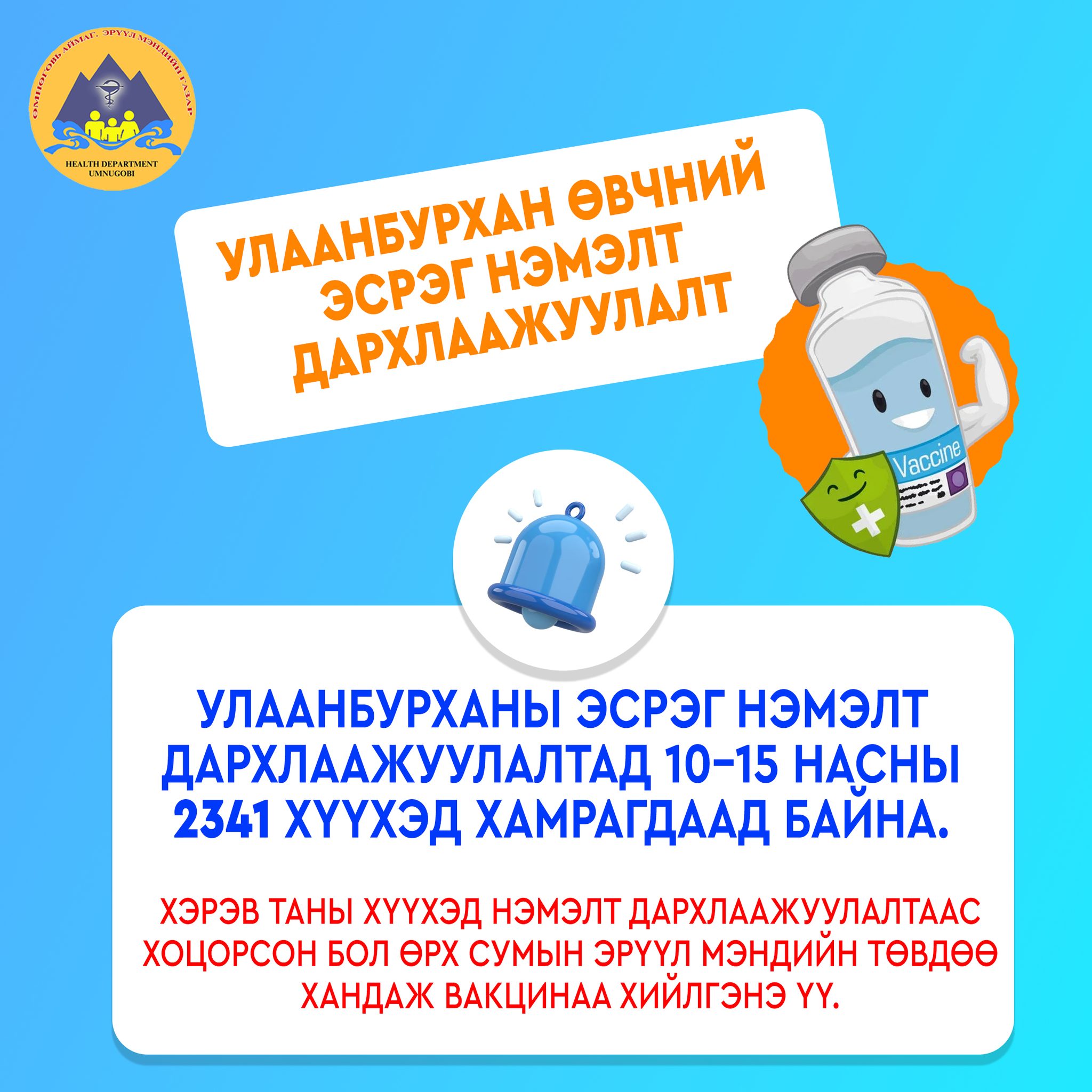 НЭМЭЛТ дархлаажуулалтаас хоцорсон бол сум өрхийн эрүүл мэндийн төвд хандан яаралтай вакцинаа хийлгээрэй.